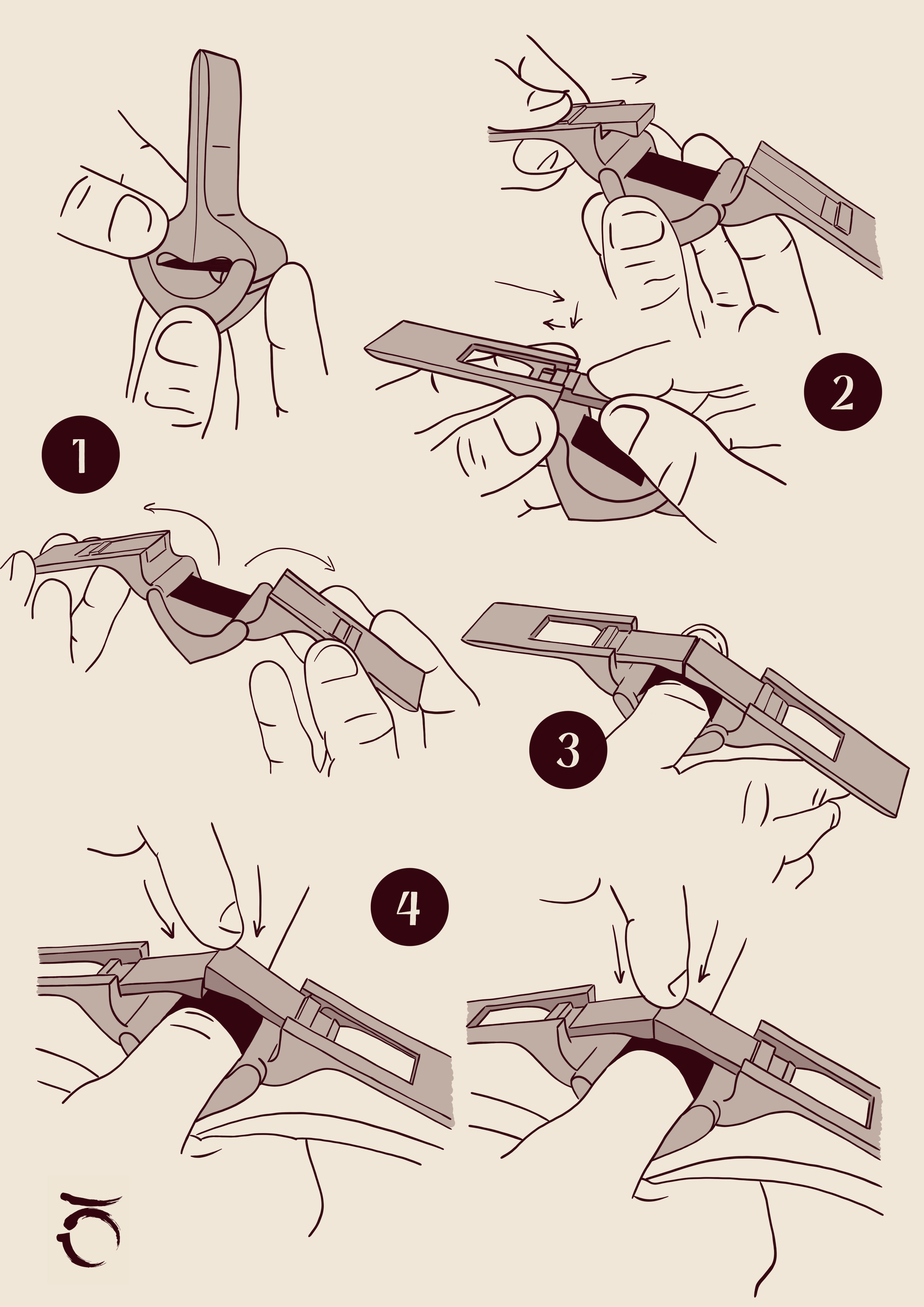 Start with the product closed (it looks like a small key). Open it by gently pulling each side apart until it forms a small “M” shape — not completely flat. - Lock the support tabs
